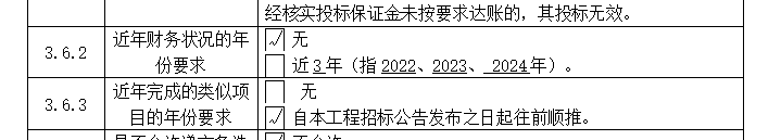 答:本项目未将“近年财务状况的年份要求”设置为强制性资格准入条件,由投标人结合自身实际情况自主决定,不作强制要求;《招标文件》第三章“评标办法(综合评估法)”中“资信标评分标准—投标人财务状况(30分)”对应的证明材料,投标人可根据自身情况自主选择是否提供。若投标人选择提供2022年至2024年财务报告作为该评审项的证明材料,则对应的“附表六:财务状况(如有)”表格为必填项,投标人须按要求完整填写并提交。