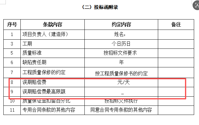 1.问:在招标文件“第八章投标文件格式第二节经济标格式二、投标函及投标函附录(二)投标函附录”中,要求填写“误期赔偿费”及“误期赔偿费最高限额”。然而,招标文件及其附件中并未明确这两项的具体约定内容,请贵方明确说明。