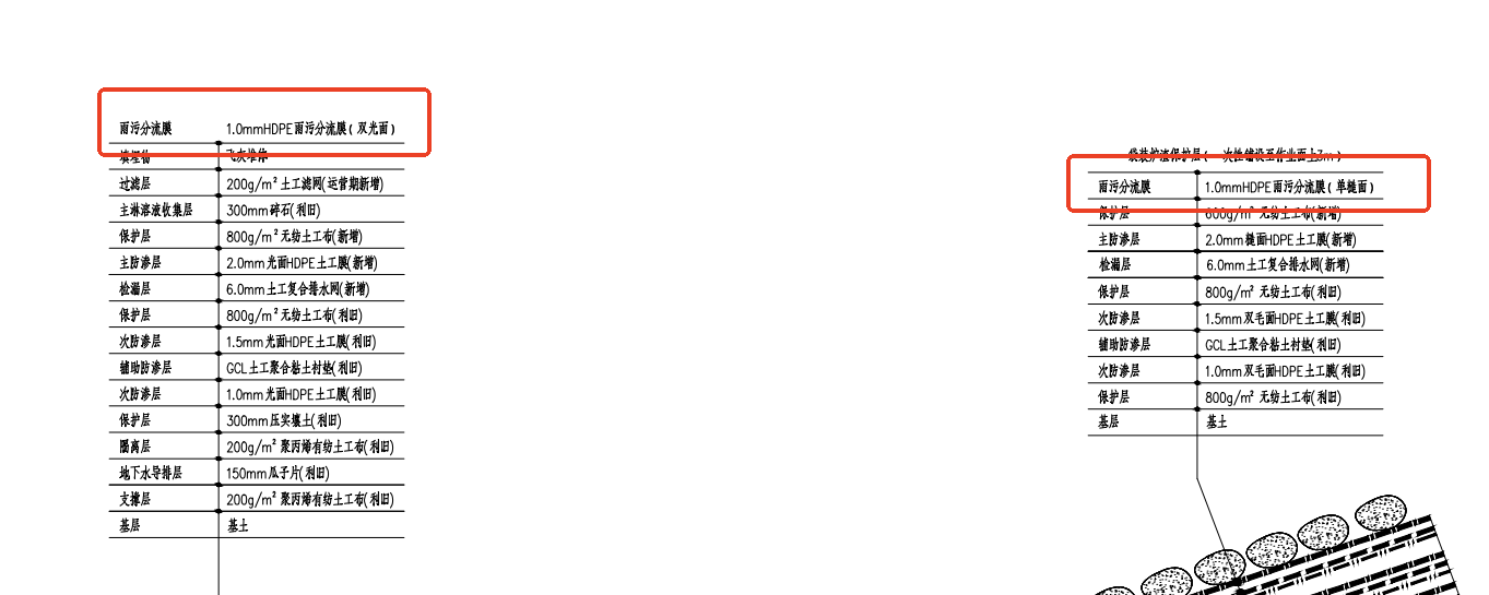 4.问:清单里1.0mmHDPE土工膜均为光面,但图纸库底和边坡分别为双光面和单糙面,请明确边坡是光面膜还是单糙膜。