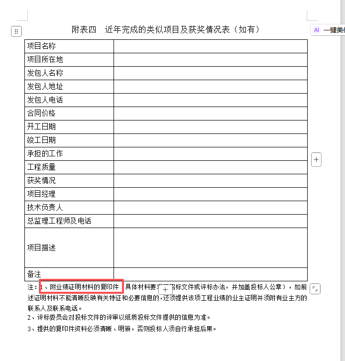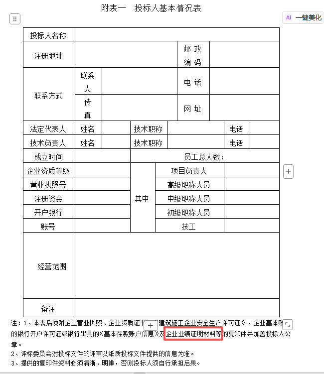 19.问:请问以下这两处表格后面是否都需要附企业业绩证明材料吗?由于业绩有评分项涉及页数会比较多,是否只在最后一个表格“附表四 近年完成的类似项目及获奖情况表(如有)”后附包含评分项的所有业绩证明材料,前面表“附表一 投标人基本情况表”之后仅需附资格项的业绩证明材料即可,请招标人予以明确,谢谢。