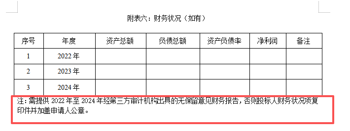 答:本项目未将“近年财务状况的年份要求”设置为强制性资格准入条件,由投标人结合自身实际情况自主决定,不作强制要求;《招标文件》第三章“评标办法(综合评估法)”中“资信标评分标准—投标人财务状况(30分)”对应的证明材料,投标人可根据自身情况自主选择是否提供。若投标人选择提供2022年至2024年财务报告作为该评审项的证明材料,则对应的“附表六:财务状况(如有)”表格为必填项,投标人须按要求完整填写并提交。