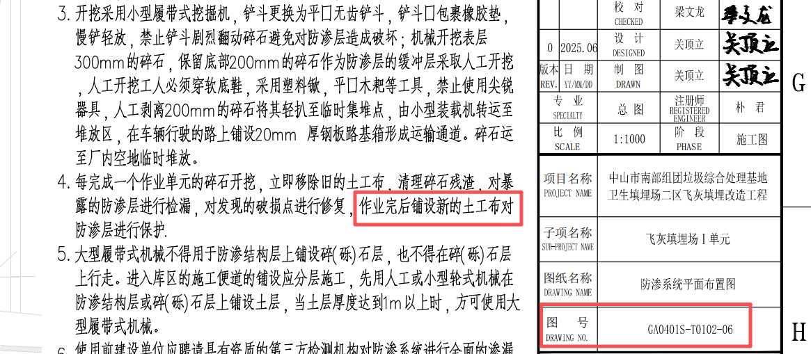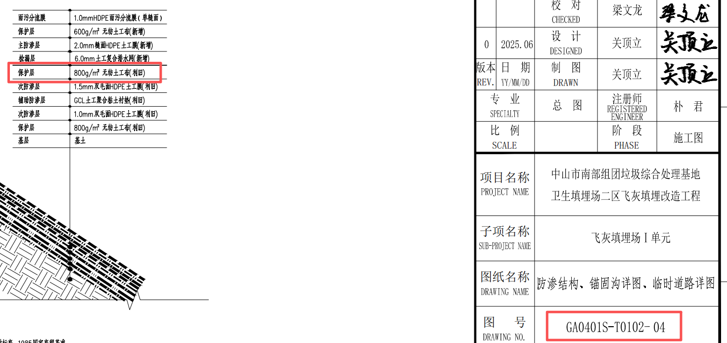 22.问:01-总平面、防渗施工图中,图号GA0401S-T0102-04中旧膜上方保护层土工布为利旧,工程量清单也未计算这部分工程量,而图号GA0401S-T0102-06说明第4条提到对旧膜进行完整性检测后,需要铺设新的土工布对防渗层进行保护,考虑到土工布拆除后很难利旧,建议增加这部分工程量。
