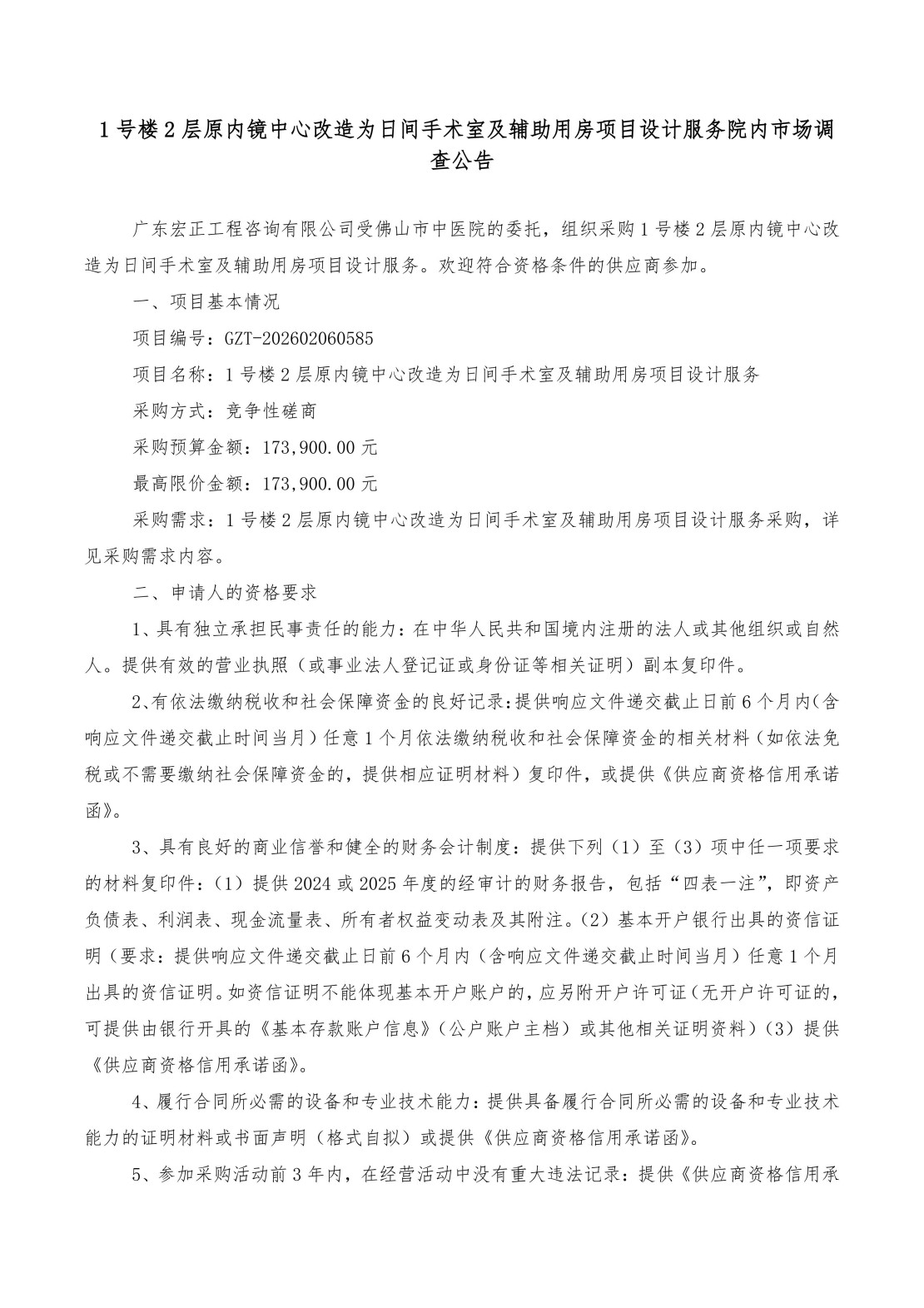 1号楼2层原内镜中心改造为日间手术室及辅助用房项目设计服务院内市场调查公告
